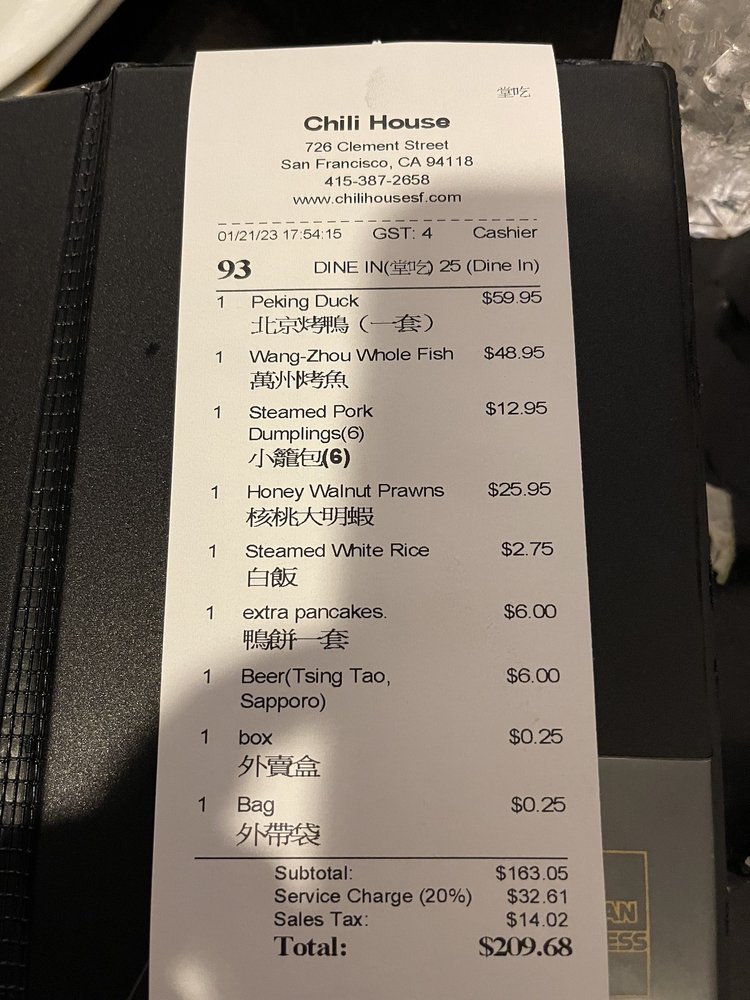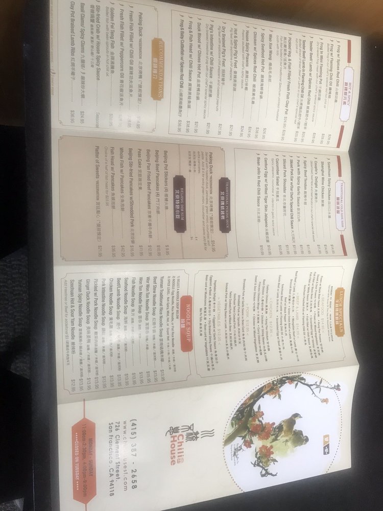 Introducing the menu at Chili House SF, a Szechuan and Dim Sum restaurant located in San Francisco. Known for its star dish, the Peking duck, which is tender and juicy, served with rice paper wraps, plum sauce, and cucumber. Customers rave about the option to use leftover duck bones and skin for crispy fried chips or duck bone broth. Other popular dishes include the Szechuan spicy chicken, cumin lamb, dry braised string beans, and the Shanghai rice cakes. The restaurant offers a variety of authentic Chinese flavors with a mom and pop feel, great for both Chinese and non-Chinese diners. Reservations are recommended to secure a taste of their famous Peking duck, along with other flavorful and satisfying dishes. Chili House SF is a must-visit for those craving authentic Szechuan and Dim Sum cuisine in a cozy atmosphere.